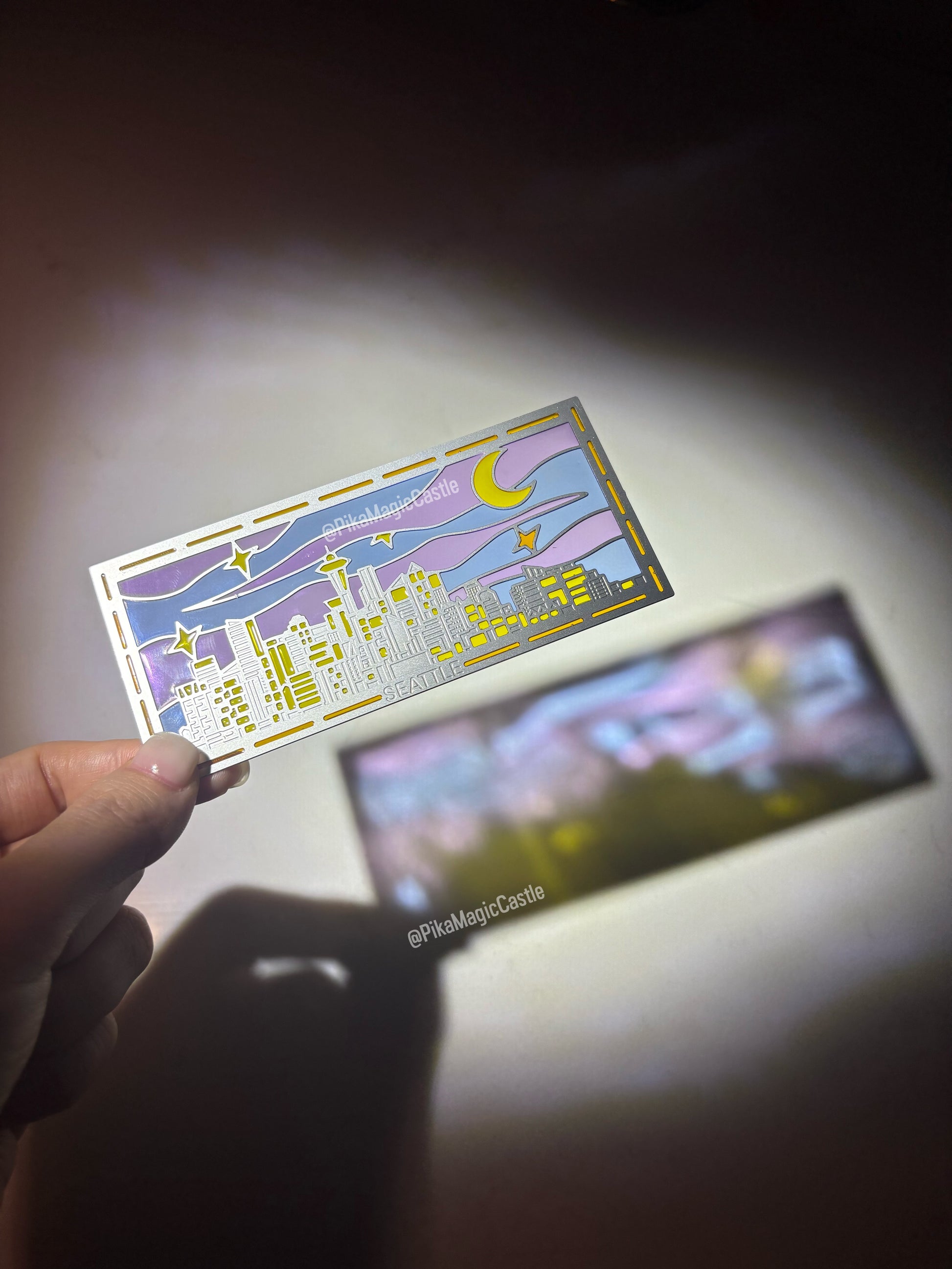 Crafted in a Tiffany stained-glass style, the piece features translucent color panels set in zinc alloy, giving it a refined weight and premium texture. The semi-transparent finish allows light to pass through beautifully, creating a luminous stained-glass effect. Ultra-thin yet detailed, it works perfectly as a bookmark while also serving as a collectible keepsake inspired by Seattle’s skyline.